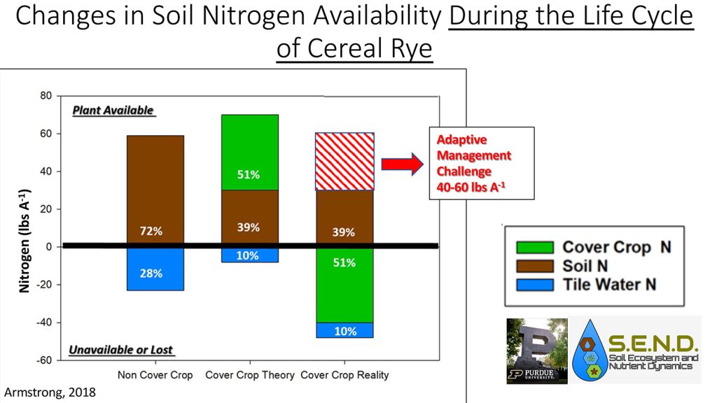 One of the early challenges Dr. Armstrong faced was with cereal rye, a commonly used cover crop. Initial experiments revealed a 6-13% reduction in corn yield following cereal rye. “We took thousands of plant samples throughout the corn’s life-cycle, with and without the cereal rye, to understand nutrient uptake patterns. We discovered that 60-75 days after terminating the cereal rye, there was a significant reduction in the nitrogen available to the corn, leading to reduced yields,” Dr. Armstrong explained. (Figure 1)