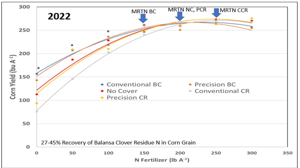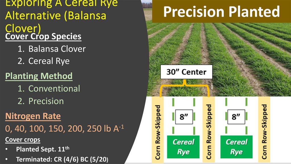 Understanding the corn’s N uptake requirements, timing of the available N from the FIXatioN Balansa Clover became crucial. Dr. Armstrong experimented with both planting “green” and planting “brown-green”. Brown-green planting involved terminating the Balansa cover crop two-weeks before planting corn to allow the clover to begin decomposition and make the clover’s N available to the corn at the V6 to V10 stage.