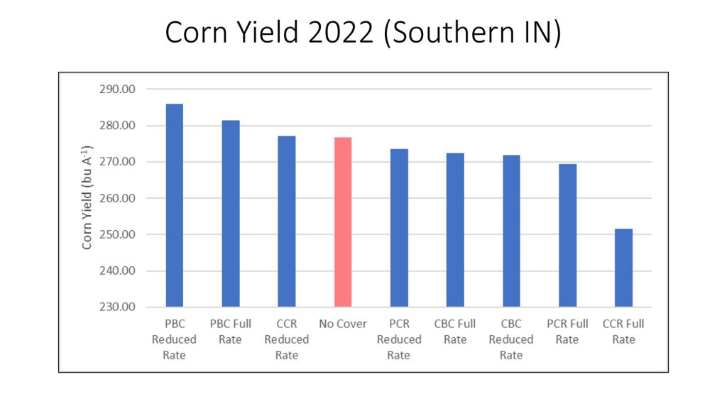 In the 2022 trial, both conventionally and precision planted Balansa clover, at a reduced seeding rate (2.5 lbs. per acre), yielded 250 bushels with only 150 lbs. of synthetic N per acre added. (Figure 3) FIXatioN Balansa Clover allows farmers to achieve competitive yields with less applied nitrogen per acre, compared to the 200-300 lbs. needed for a non-cover crop or cereal rye. Including the cost of FIXatioN Balansa Clover seed and termination management, this reduction in synthetic fertilizer can increase profits by $20-70 per acre.