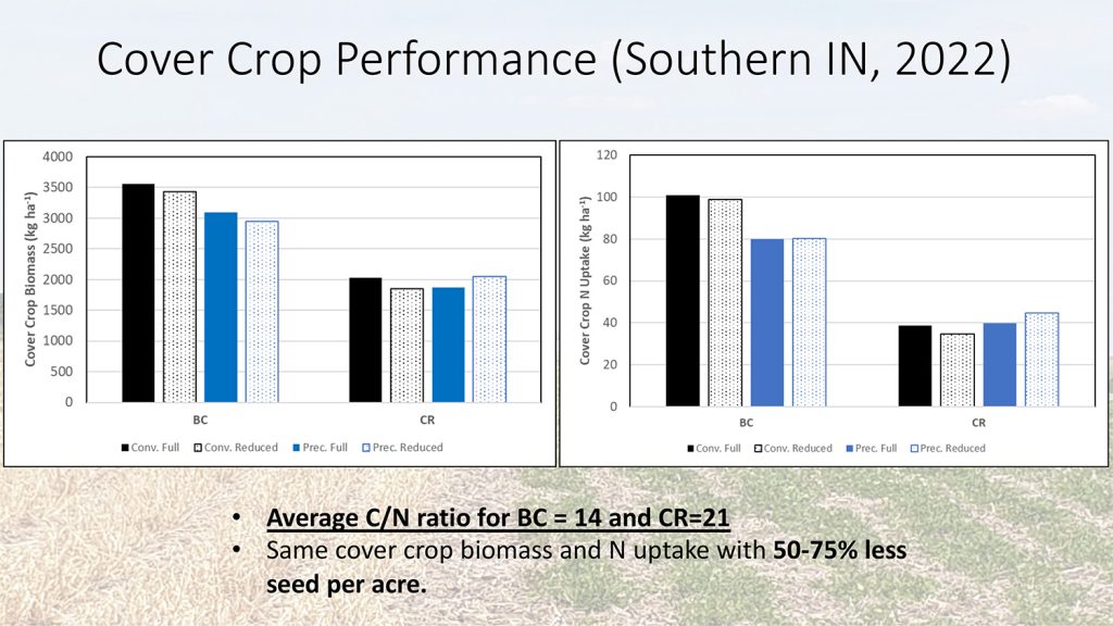 Precision planting has been another crucial aspect of Dr. Armstrong’s research. By planting cover crops in specific patterns to minimize competition with cash crops, farmers can improve both the biomass and nitrogen efficiency of their cover crops. (Figure 5) “Precision planting involves planting cover crops in strips with designated gaps for corn, which reduces negative reactions between the two when the corn seed is planted,” Dr. Armstrong explained.